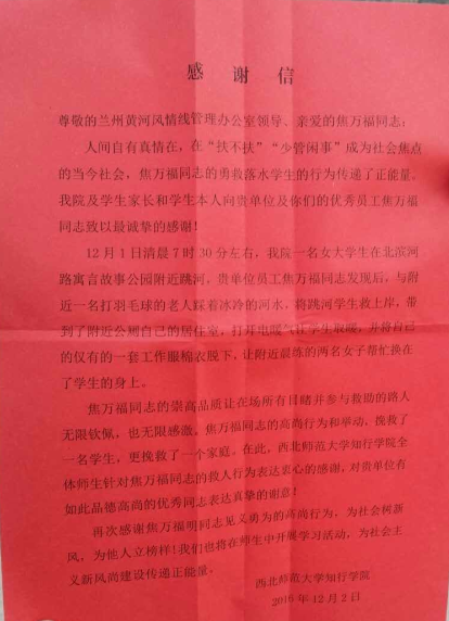 据附近目击者张先生介绍,保洁员焦先生将这名女子从黄河里救出后,落水女子已经浑身湿透,脸色青紫,但还有意识,焦先生赶紧将该女子带到了附近公厕自己的居住室,打开电暖气取暖。随后,焦先生将他仅有的一套工作服棉衣脱下,让附近晨练的两名女子帮忙换在了这名落水姑娘的身上。“当时这名跳河姑娘一言不发,面对电暖气只打冷颤。”张先生说,过了一会儿,跳河女子打电话叫来几名同学,才得知该女子是西北师范大学知行学院的在校大学生。随后,该女子被赶来的120急救车送往兰州总医院安宁分院进行救治。据了解,跳河女子正在急救室救治,门外有多名同学和老师守候。一名抱着焦先生工作服的同学介绍,他们也不清楚这位同学因何跳河,但幸好得到及时急救,身体没有受到伤害。他们都对两位老人及时施救,才使得跳河的女同学幸免于难的行为一再表达了谢意。