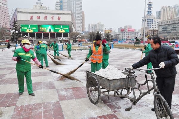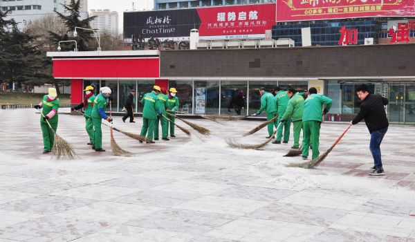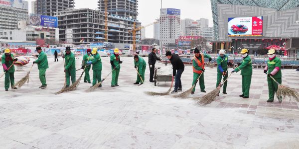 虽然雪下的不大,但气温骤降、风雪交加还是给扫雪人员带来了诸多不便,可这没有影响各项目部团队清理积雪的热情,在项目经理的带领下,各班组成员对自己主管的片区进行认真清扫,确保能够在业主上班前让各主干路内的行人及车辆畅通无阻,把下雪带来的影响降至最低。