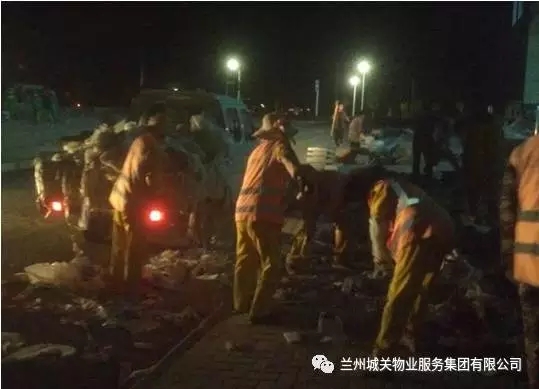 员工于夜晚加班清理宿舍楼下的垃圾