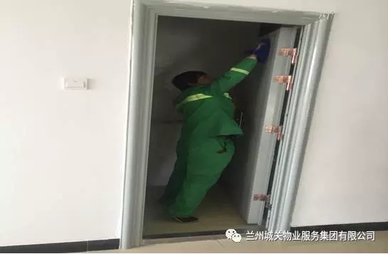 正在擦拭宿舍楼内的楼梯间门上的灰尘