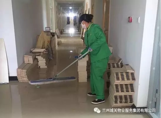 正在清理宿舍楼内的地面卫生