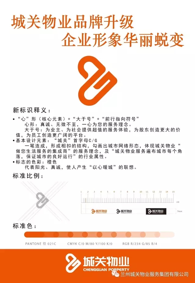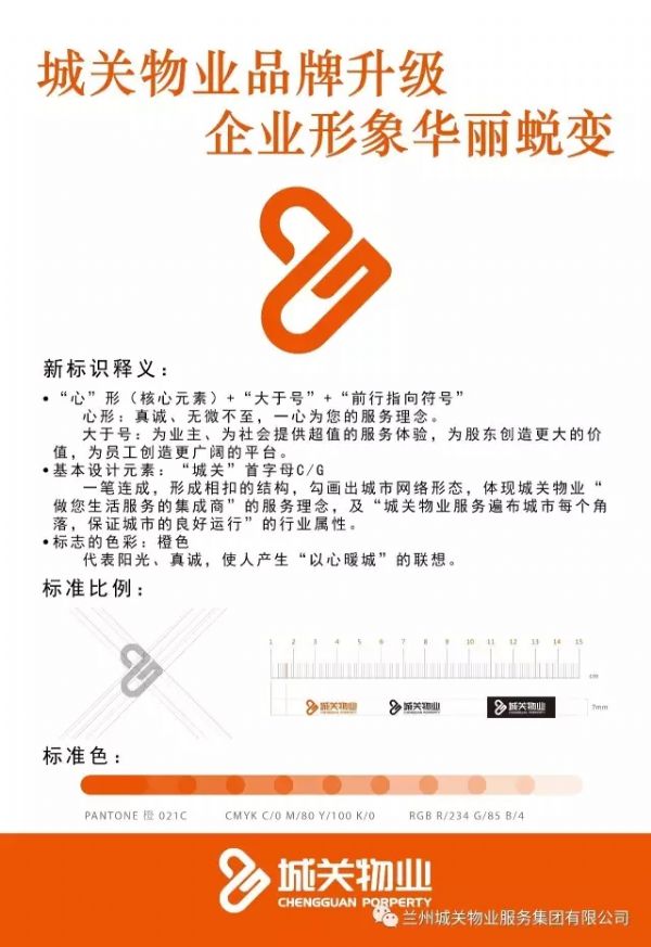 标识是企业品牌使用频率最高的视觉符号,是形成品牌视觉形象的核心元素,还是品牌形象的象征与精神体现。城关物业服务集团新企业标识采用了橙色,代表阳光、真诚,使人产生“以心暖城”的联想。并将心形、大于号、前行指向符号作为核心设计元素集于一体。