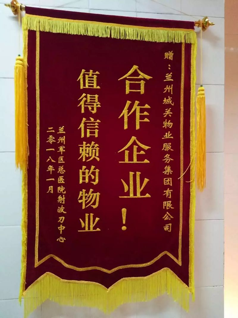 在2017年度兰州军区总医院年底的安全、卫生检查工作中,城关物业8012项目部员工以饱满的精神、专业化的服务迎检,从很多方面凸显了城关物业服务特色,给院方领导留下了深刻的印象。为感谢城关物业多年来的用心服务,兰州军区总医院射波刀中心于近日向城关物业8102项目部赠送了题有“值得信赖的物业合作企业”的锦旗,以此表达对城关物业服务集团工作的肯定和感谢!
