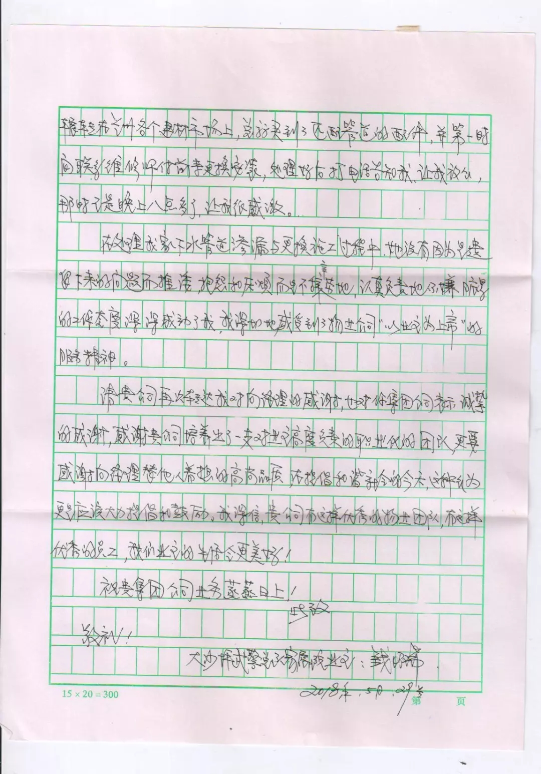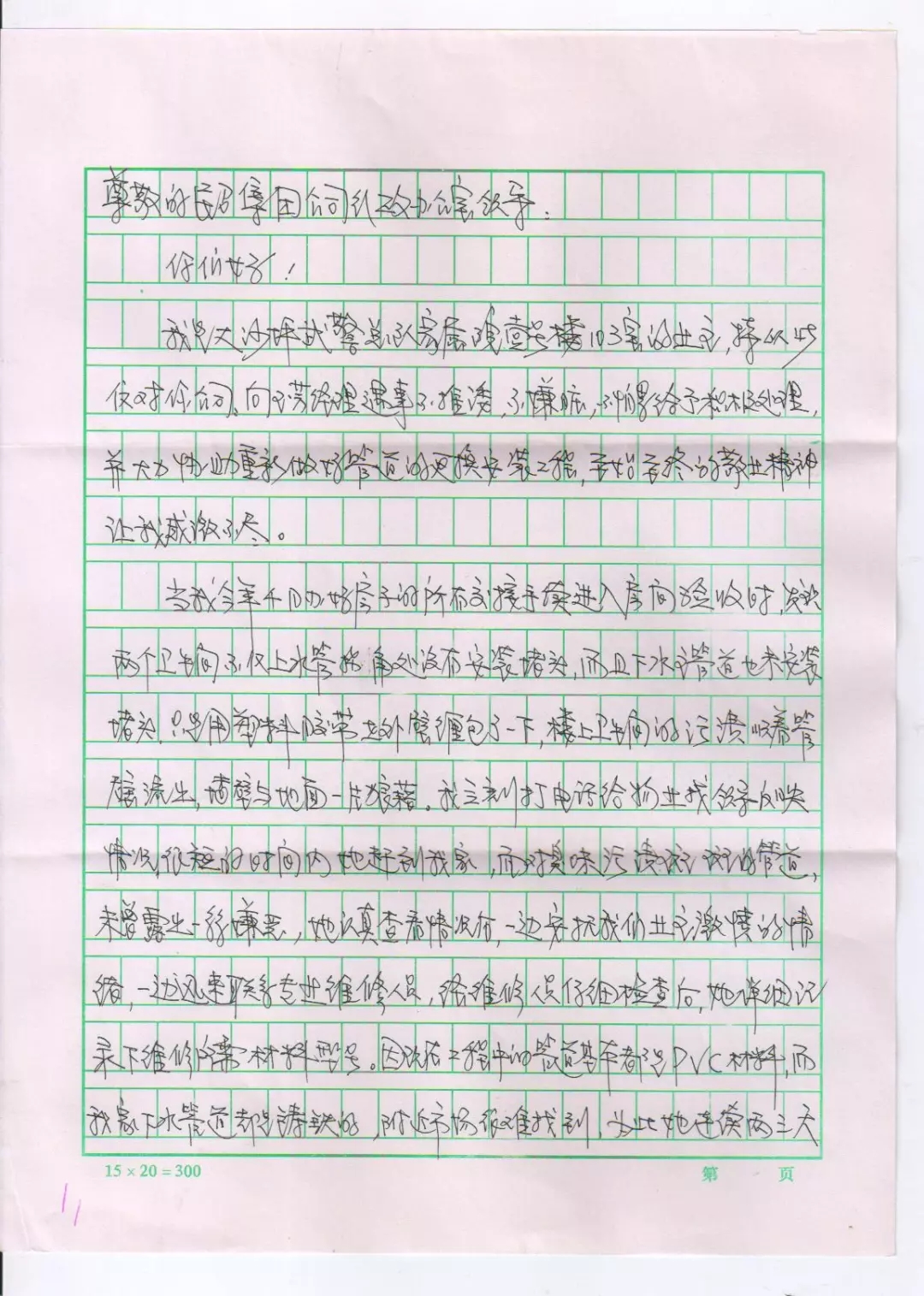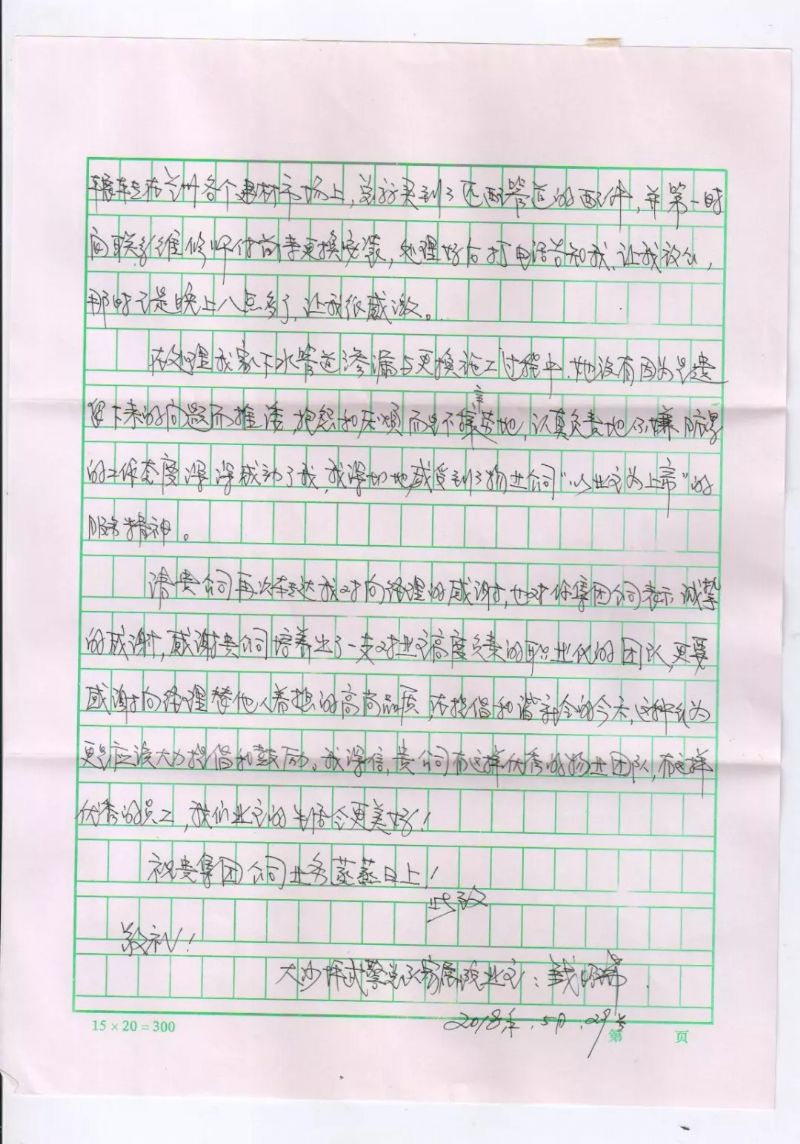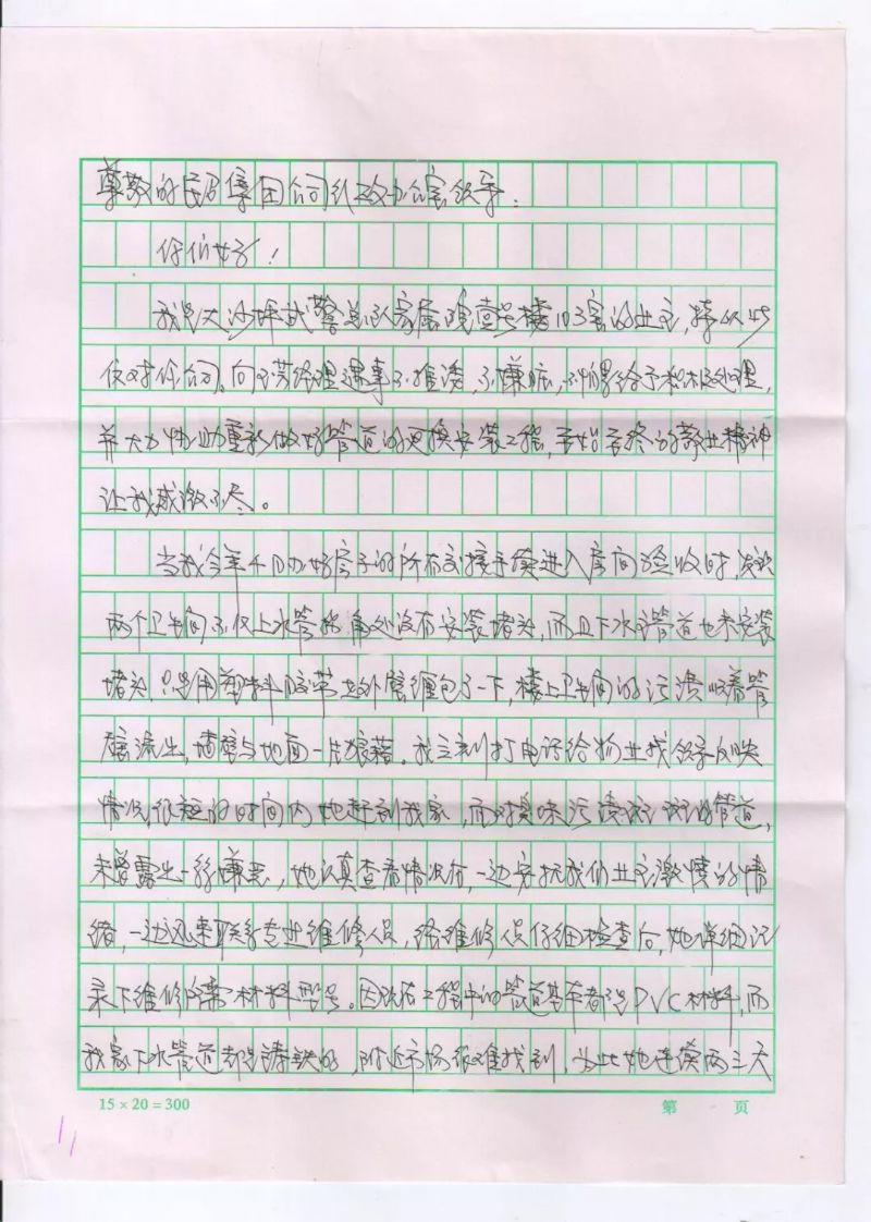 在为钱先生解决下水管道渗漏问题及安装更换的过程中,向玉芳经理没有一丝推诿,没有一句抱怨,不嫌脏乱、认真负责的工作态度得到了业主的肯定和赞誉。业主钱先生特意写来感谢信,以此来表达对向玉芳经理的感激之情,及对城关物业服务工作的肯定和赞扬。
