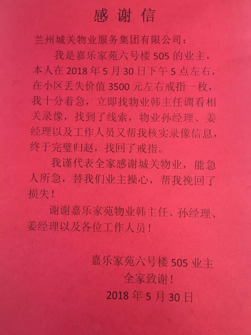 家住嘉乐家苑6号楼505的业主林女士,不慎将一枚戒指遗失在小区内。丢失了戒指的林女士万分着急,来到物业服务中心寻求帮助。城关物业嘉乐家苑项目部经理韩元春得知情况后,立刻调阅查看当天监控视频,经过仔细排查后找到了相关线索,并顺利寻回失物,及时挽回了业主的财产损失。看到戒指完璧归赵后的李女士感激万分,特将感谢信送至公司,以此表达对城关物业的赞扬。