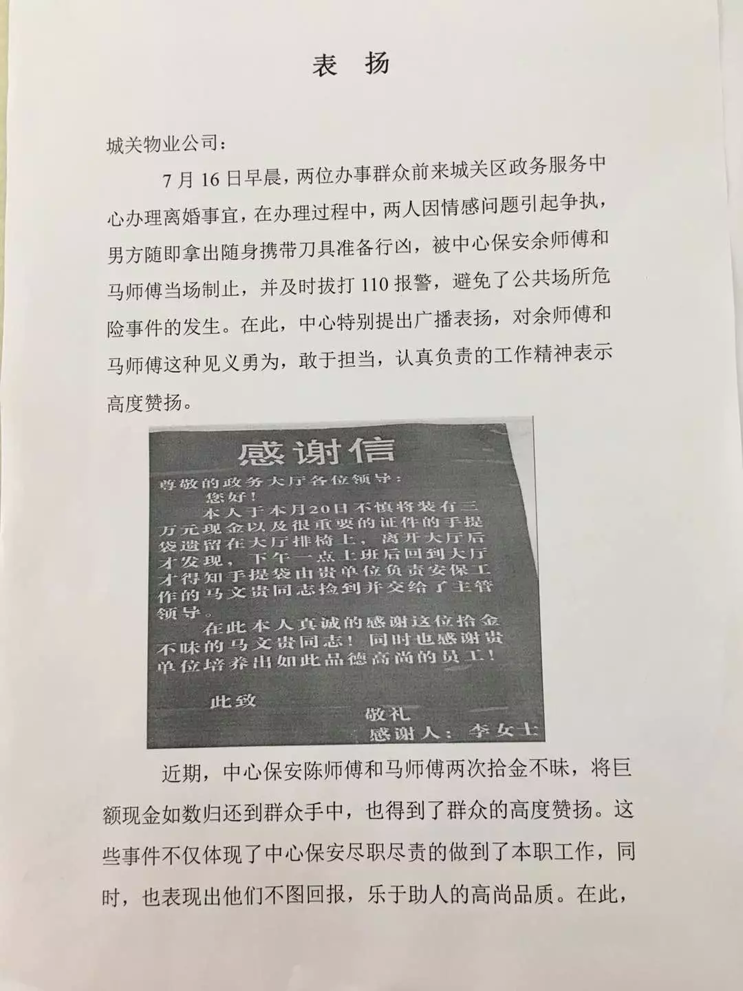 7月16日,城关物业秩序维护员马文贵和余会明在城关区政务服务大厅,见义勇为,夺刀救人;去年12月20日,马文贵和程斌也在这里拾金不昧,物归原主。城关区政务服务中心和当事人都心怀感激,写了感谢信给他们。感谢他们时时刻刻维护着他人的生命和财产安全。