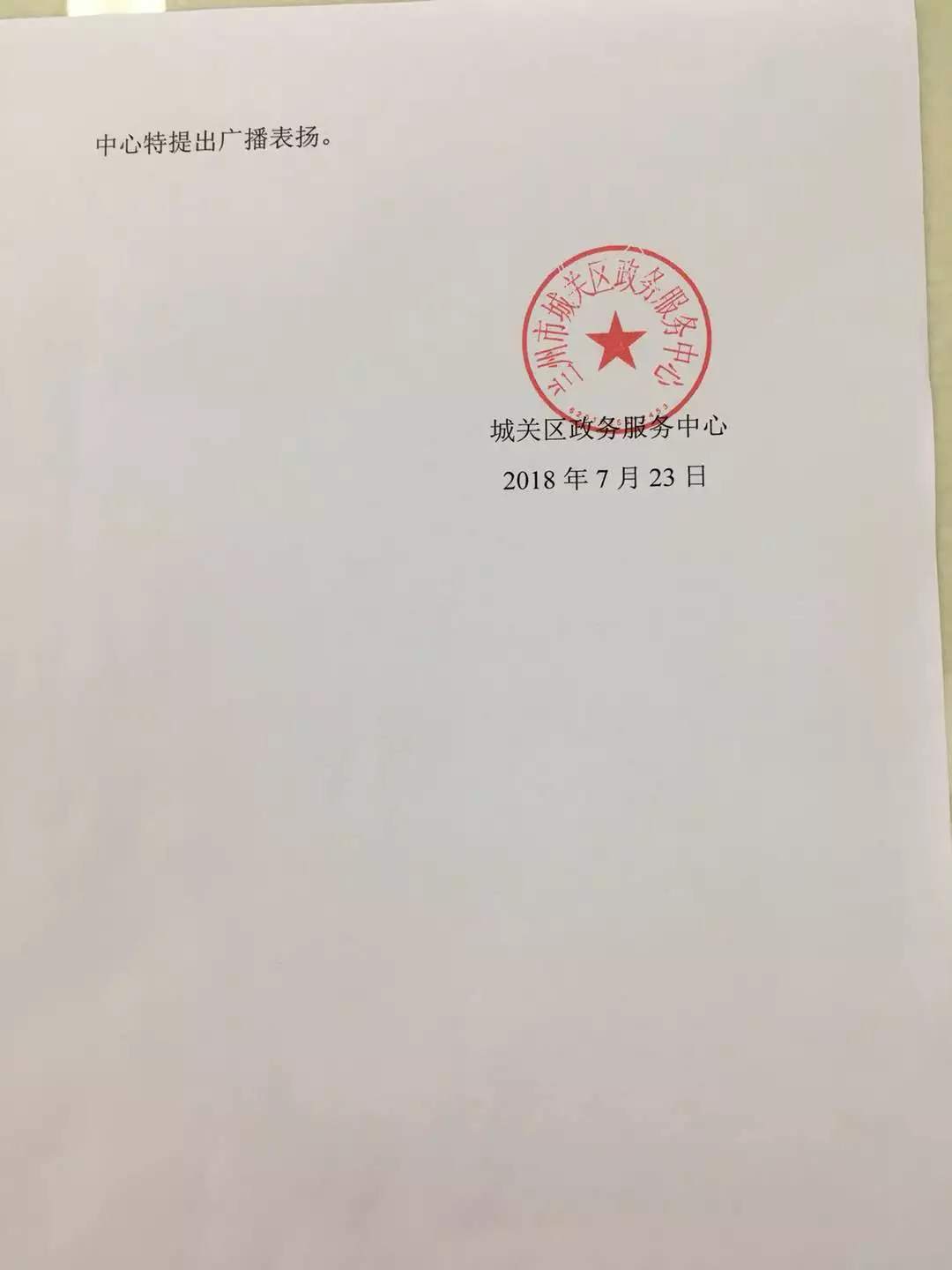 ▲城关区政务服务中心给城关物业马文贵和余会明的感谢信