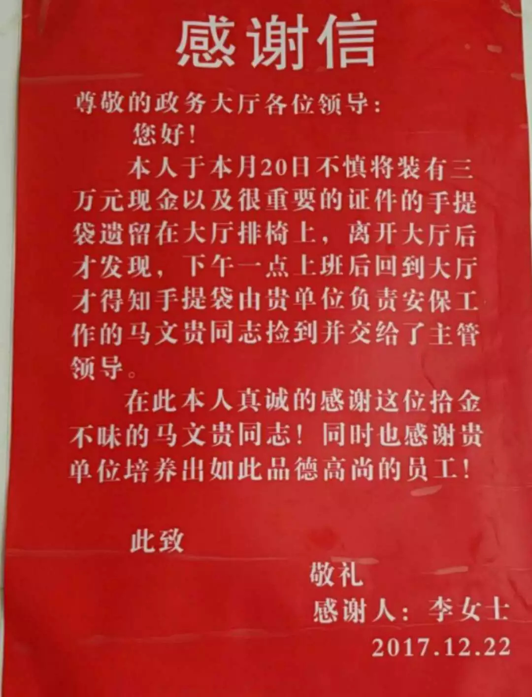 在他还有秩序维护员余会明、程斌的眼里看起来“很平常的事”,深深感动了很多人,城关区政务服务中心和钱款失而复得的李女士,都给他们送去了感谢信。感谢他们的见义勇为,保卫了他人的生命安全,感谢他们拾金不昧,化解了他人的重大损失。