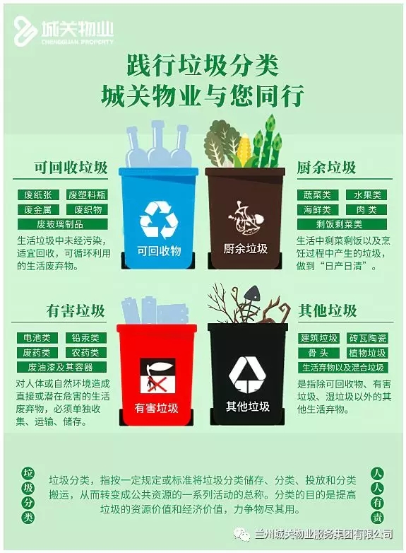 为有效推进城关物业所辖小区垃圾分类工作的有序开展,先后在各小区购置新型四色分类垃圾桶(包括可回收物、易腐垃圾、有害垃圾和其他垃圾),配备垃圾棚,集中打造生活垃圾分类投放点,方便业主更好地分类投放。