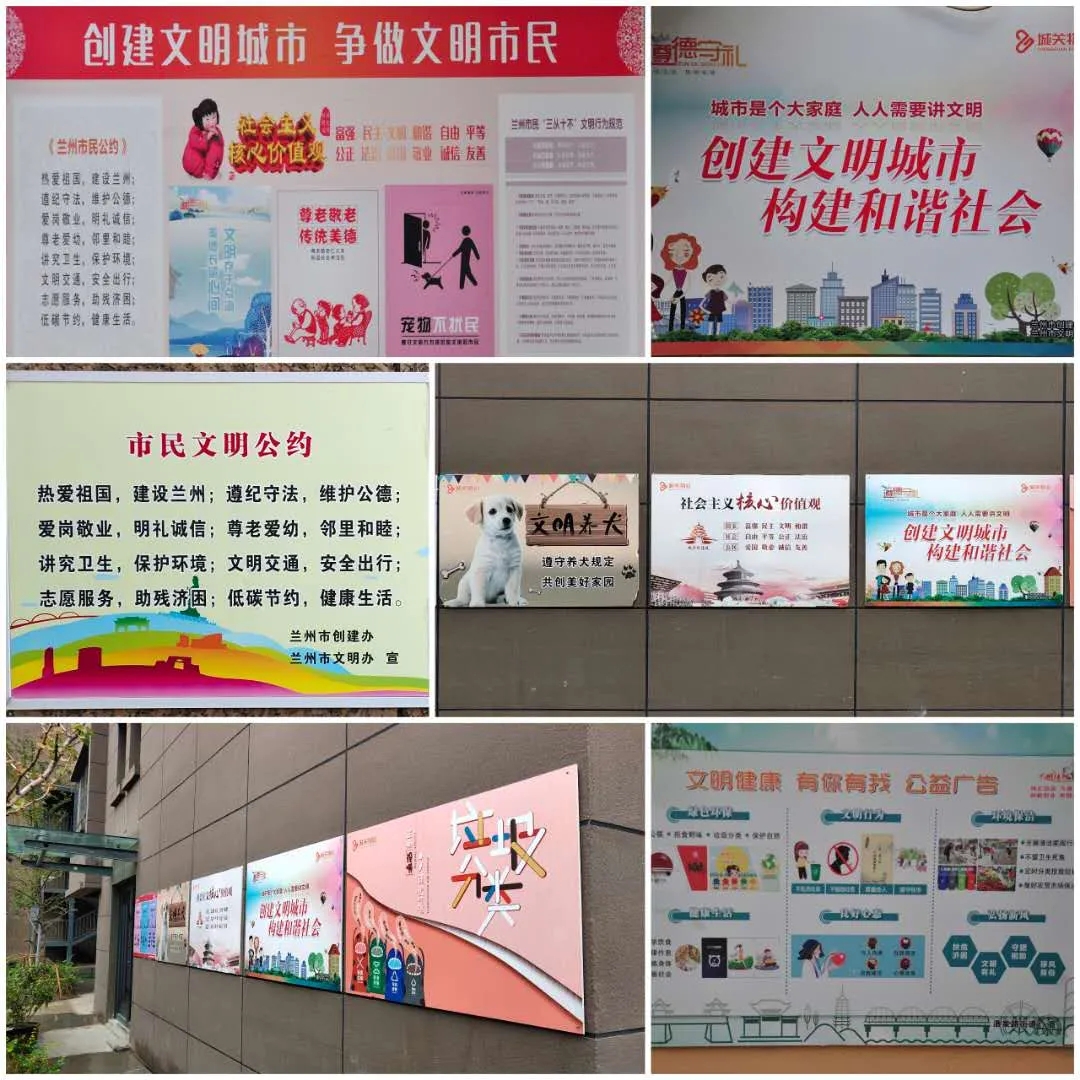 城关物业在创文期间加大工作力度,保证环境整洁,同时积极开展“精神文明”建设工作,在小区内各显著位置张贴创文宣传海报、宣传展板,专门设立“兰州市文明志愿者”岗,为业主宣传创文工作。