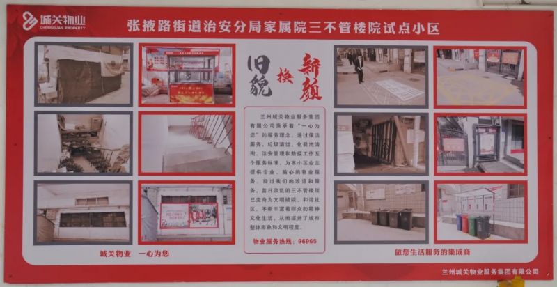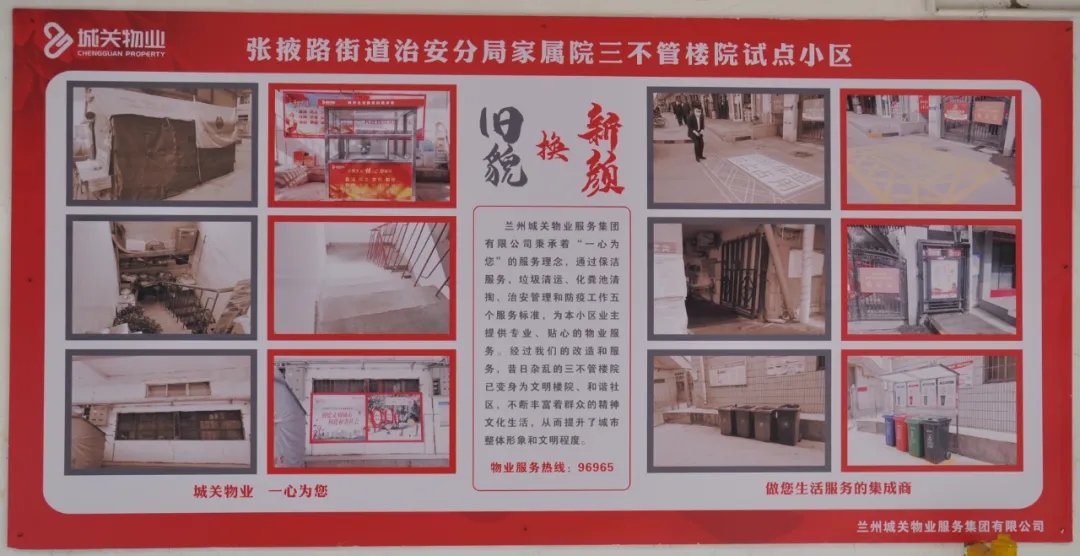 兰州城关物业全面接管城关区老旧楼院后,采取先期介入、分层改造等新模式,启动实施“三不管”楼院物业全覆盖整治工作,通过环境卫生改造,基础设施维修,安全秩序维护等方面工作,把‘三不管’楼院变成‘三要管’。我们将继续努力,持续推进城关区老旧楼院改造,不断引入多元化服务,全面提升服务质量,提升业主的幸福感和满意度!