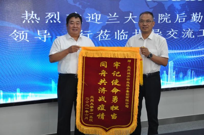 兰州大学第一医院后勤保障处陈处长一行人专程来到博亚体育app,将一面写有“牢记使命勇担当 同舟共济战疫情”的锦旗赠予博亚体育app,以此表达对城关物业的感谢和认可。