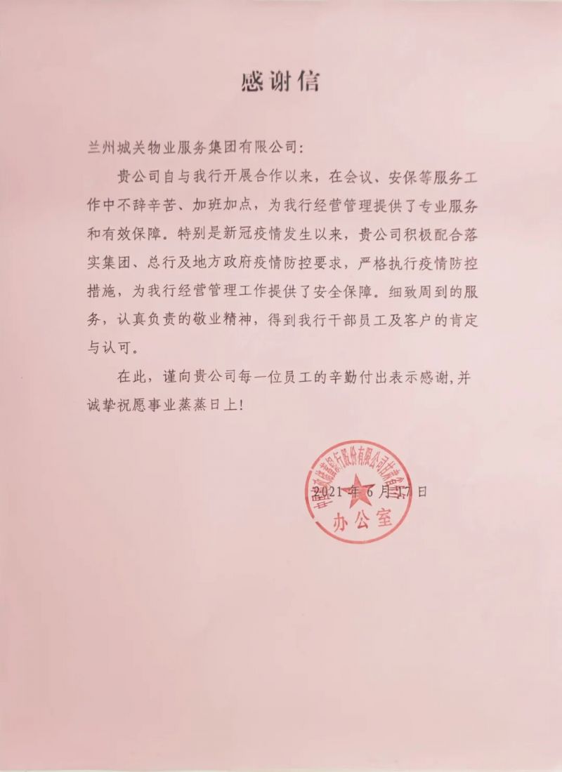 中国邮政储蓄银行甘肃省分行是城关物业服务的众多项目之一,自合作以来,我们在会议、安保等服务工作中为甲方提供了专业服务和有效保障;尤其在疫情期间,我们严格执行疫情防控措施,为银行的正常运转提供了安全保障。我们认真负责的工作态度和不辞辛苦、加班加点的敬业精神得到了银行员工及服务客户的肯定与认可。