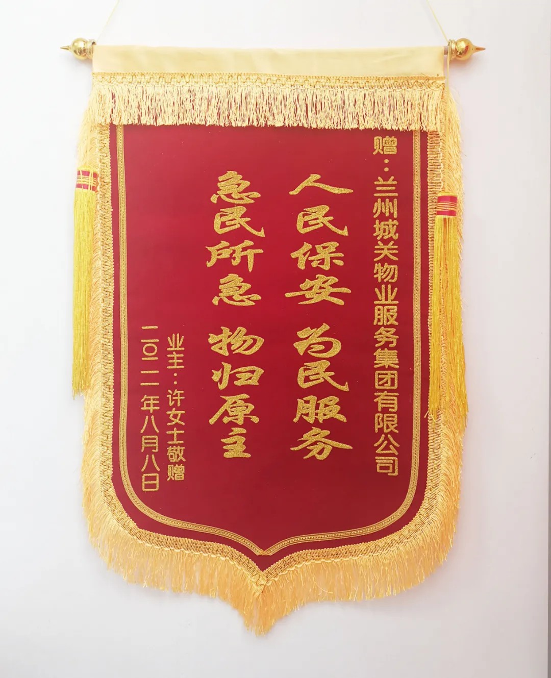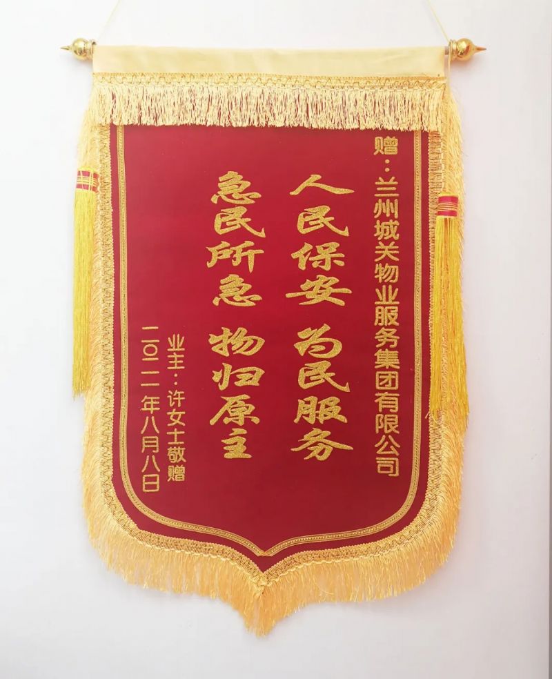 重邦康城小区业主将一面写有“人民保安,为民服务,急民所急,物归原主”的锦旗送到我们手中。业主在进入小区后不慎将贵重的车钥匙遗失在小区内,物业工作人员立即帮助业主进行寻找,最终在很快的时间内找到钥匙,物归原主。业主表示感谢,送来锦旗。