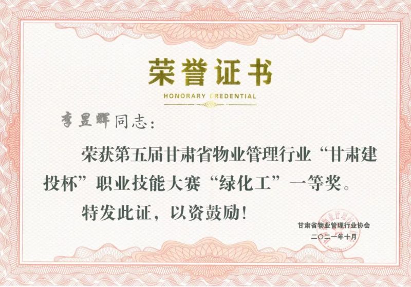 李昱辉是兰州城关物业红星紫郡项目部的一名普通绿化工,三年多的时间里每天任劳任怨,及时完成自己工作的同时,也乐意帮助同事完成其他工作,得到了同事和业主的一致好评。这次比赛期间他精心准备,认真复习,最终获得了绿化组的一等奖。
