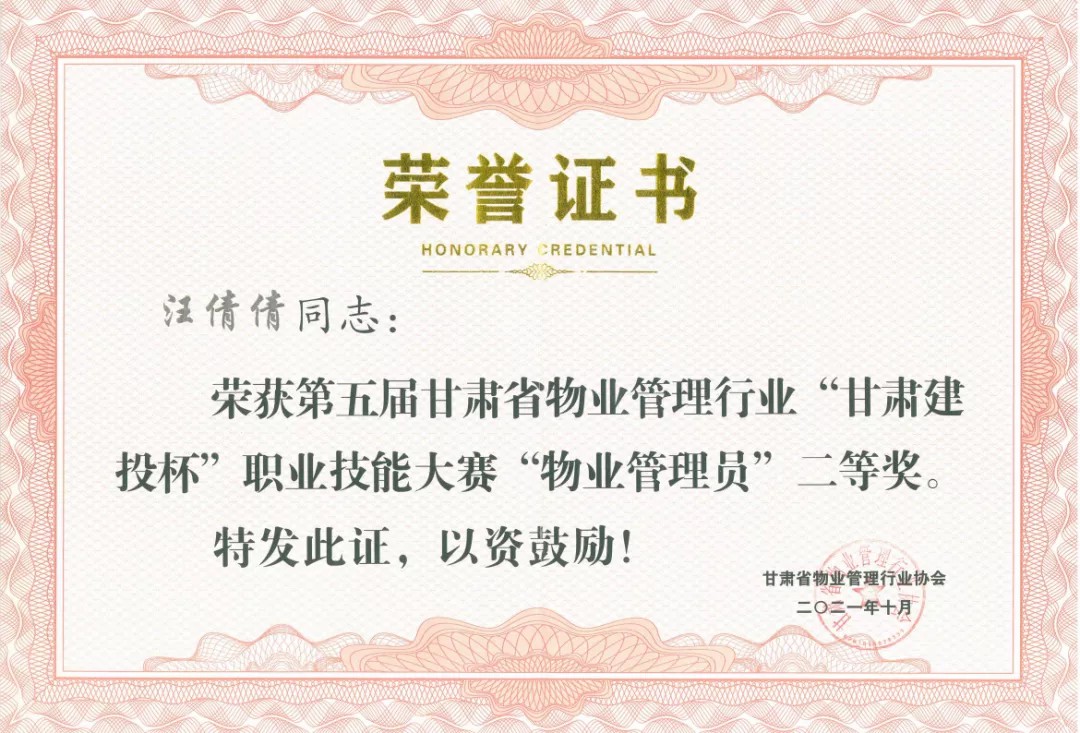 汪倩倩在安宁馨苑项目部工作期间,紧紧围绕集团“一心为您”的服务理念,认真执行公司各项管理制度、履行本职工作,把业主的事当做自己的事去做,同时不断加强自身学习,提高工作能力,比赛中充分发挥了自己的业务水平,荣获物业管理员组二等奖的殊荣。