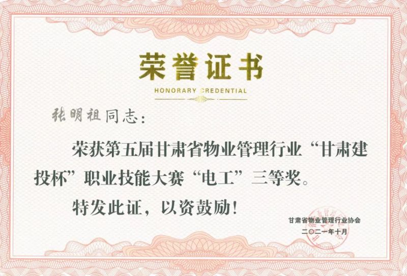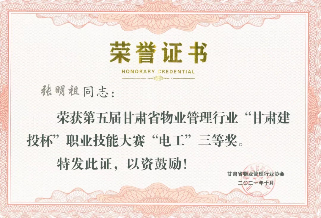 张明祖在省建行项目部工作,他始终保持政治思想过硬,爱岗敬业、严于律己,在平常的工作中不断地提高自己的专业水平,加强自己技术方面的学习,了解更多的设备设施的使用和维修知识,他刻苦钻研、脚踏实地和兢兢业业的做事态度得到了领导和甲方的认可,也帮助他在比赛中取得了优异的成绩。