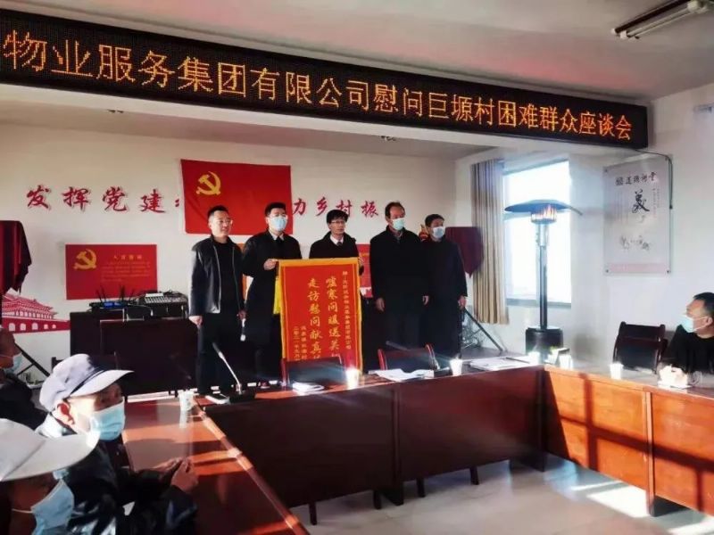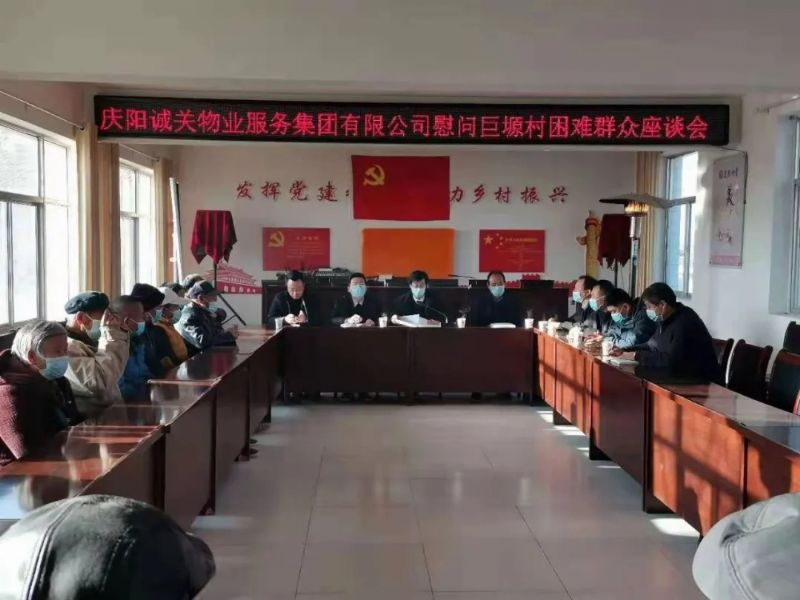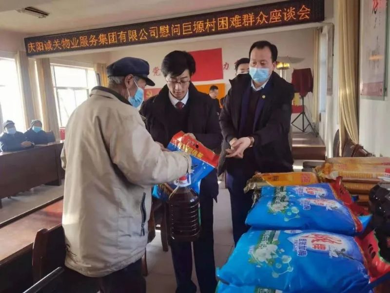 庆阳分公司慰问座谈会现场庆阳市西峰区房产中心主任张海鹏、温泉镇农财中心主任张维龙、城关物业庆阳子公司总经理王新明带队,来到温泉镇巨塬村慰问贫困群众,并在村部举行了慰问座谈会。会上,王新明对公司情况进行了介绍,表达了积极帮助贫困村经济发展和吸纳贫困户优先在公司就业的意愿,现场向20户贫困群众发放了大米、食用油、洗衣粉等慰问品。会后,王新明和镇村干部又对行动不便的3户贫困群众进行了走访慰问,了解困难原因,表达关切之情,同时表示愿意为他们提供更多的帮助。 走访慰问贫困群众