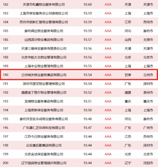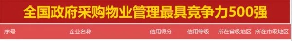 3月12日,政府采购大数据研究院和政府采购大数据网联合发布了全国政府采购物业管理服务最具竞争力500强,城关物业凭着过往良好的履约情况和风险管控能力成功入选,以93.54分的信用得分荣获第190名,成为甘肃省唯一入选前500强的企业。